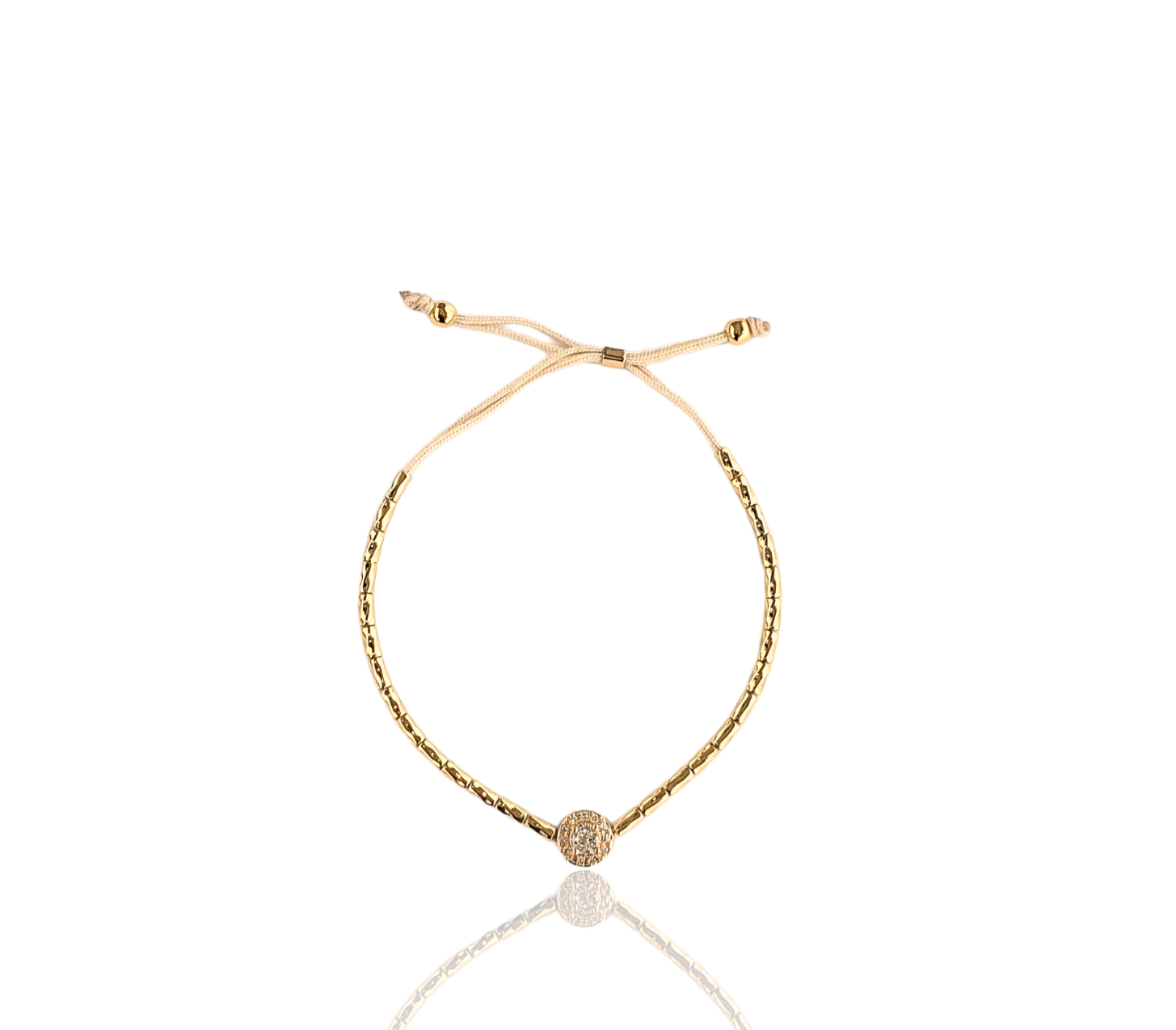 O pingente de meia esfera cravejado de cristais preciosos, confere um toque de brilho e glamour extra à pulseira. A base em fio de seda garante conforto absoluto ao toque da sua pele, tornando o uso desta pulseira um verdadeiro prazer.